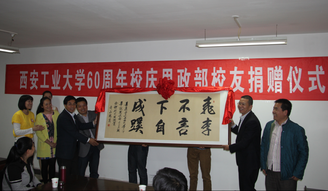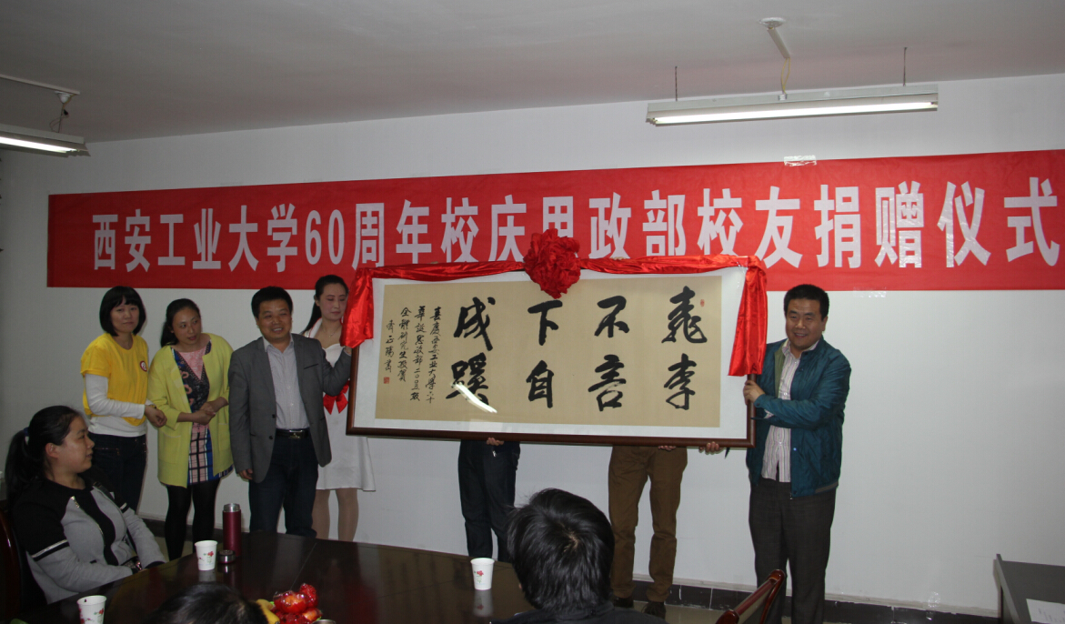 校友姚鹏、李明伟、苏柔伊、王迪等代表马克思主义理论学科2005级全体研究生向思政部捐赠“桃李不言,下自成蹊”牌匾,向母校60华诞献礼。思政部主任田亮教授、副主任王苏喜教授代表思政部接受了捐赠。2005级校友、咸阳师范17直播