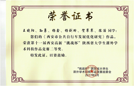 王苏喜教授指导、2015级研究生王晓阳等完成的作品《西安市公共自行车发展优化研究》经过省赛的层层选拔,最终荣获“挑战杯”陕西省大学生课外学术科技作品竞赛二等奖的好成绩。