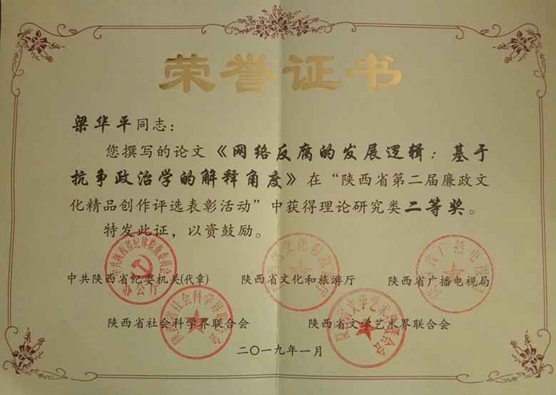 近日,17直播 副院长梁华平老师撰写的论文《网络反腐的发展逻辑:基于抗争政治学的解析角度》在“陕西省第二届廉政文化精品创作评选表彰活动”中荣获理论研究类二等奖。
