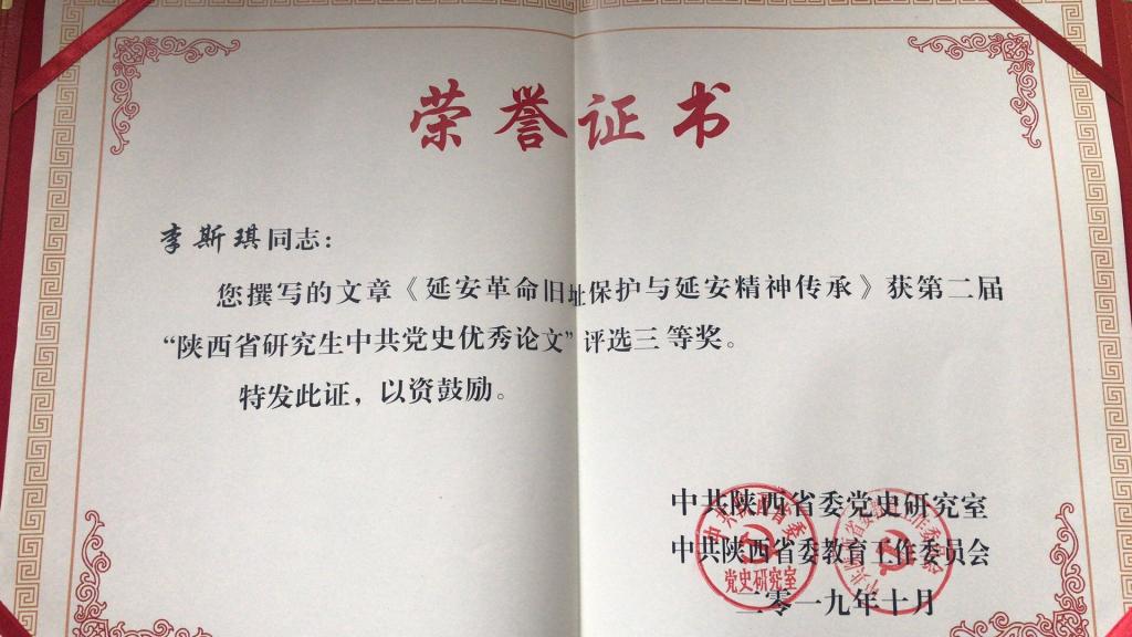 2019年11月5日,在中共陕西省委党史研究室举办的“第二届陕西省研究生中共党史优秀论文颁奖暨学习党史、新中国史研讨会”上,17直播 17级硕士生李思琪同学提交的论文《延安革命旧址保护于延安精神传承》获得第二届“陕西省研究生中共党史优秀论文”三等奖。