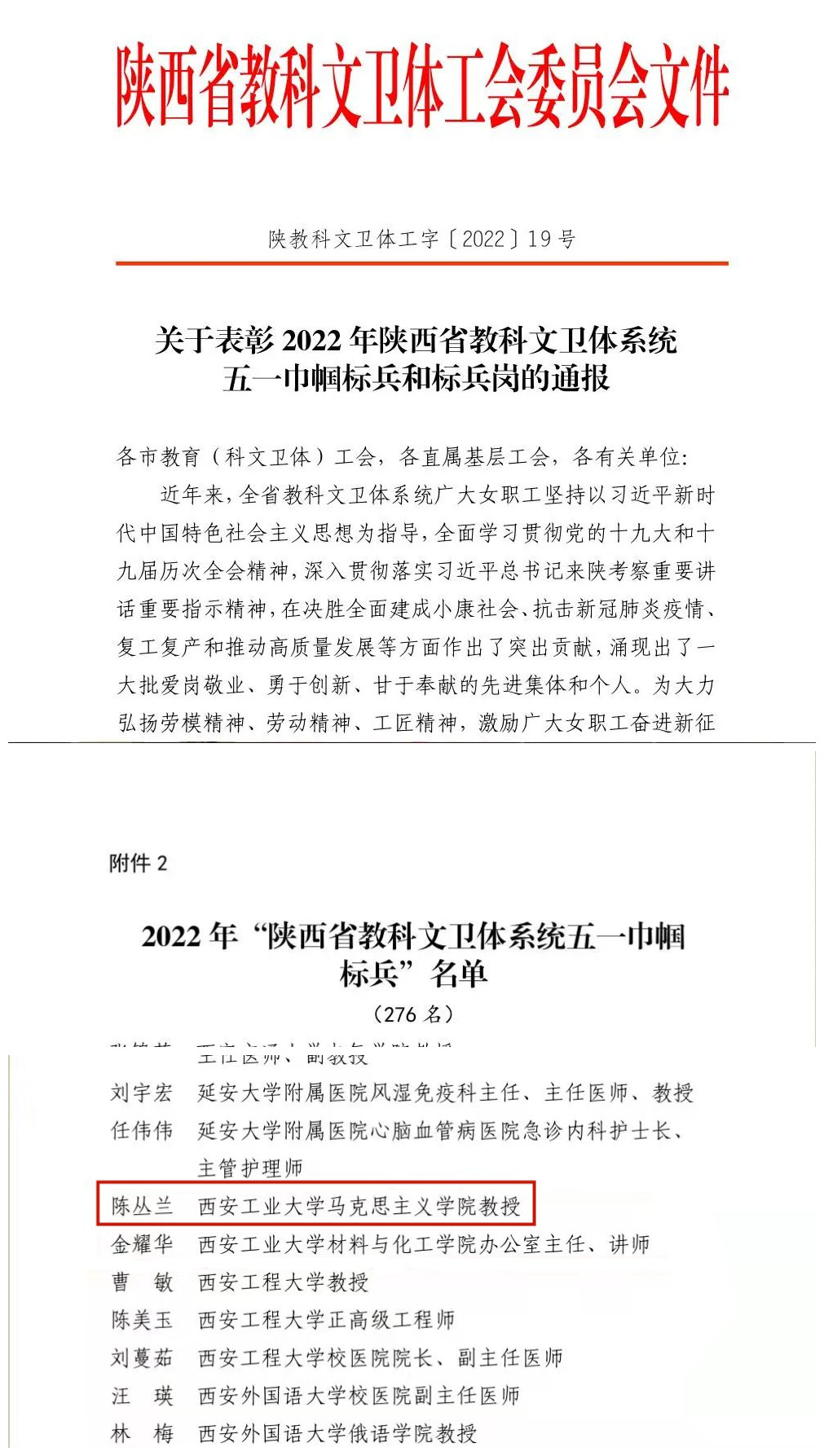 陈丛兰教授获得“2022 年陕西省教科文卫体系统五一巾帼标兵”荣誉称号。