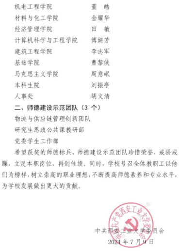 周意岷副教授获师德标兵,研究生思政公共课教研部获师德建设示范团队。