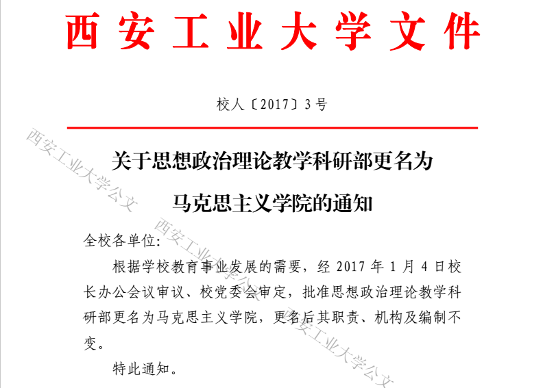 经2017年1月4日校长办公会审议、校党委会审定,批准思想政治理论教学科研部更名为17直播 ,更名后其职责、机构及编制不变。