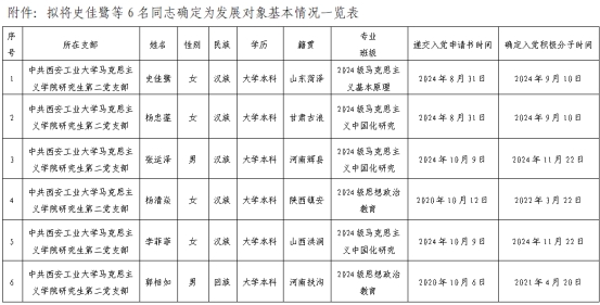 研究生第二党支部一年以上的培养教育和考察,拟将史佳鹭等6名同志确定为发展对象(名单见附表)。为进一步增强发展党员工作的透明度,确保新发展党员的质量,根据《中国共产党章程》和《中国共产党发展党员工作细则》,现将发展对象的基本情况予以公示: