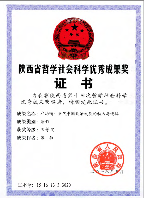 517日,陕西省社会科学界联合会第五次代表大会在西安召开。大会开幕式上举行了陕西省第十三次哲学社会科学优秀成果奖颁奖。省委书记胡和平出席大会并向获奖代表颁发了获奖证书。17直播 张敏博士的专著《非均衡:当代中国政治发展的动力与逻辑》喜获陕西省陕西省第十三次哲学社会科学优秀成果三等奖,标志着17直播 科研工作取得了新的突破。