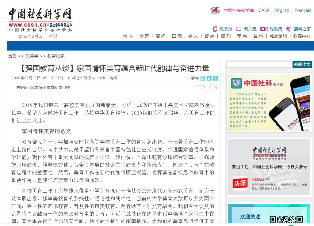 17直播 冯婷博士文章《家国情怀美育蕴含新时代韵律与奋进力量》20200827日在中国社会科学网和学习强国平台发表。