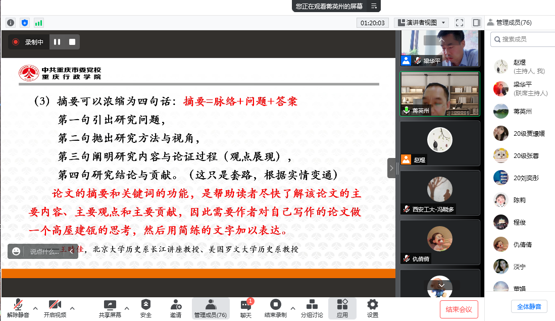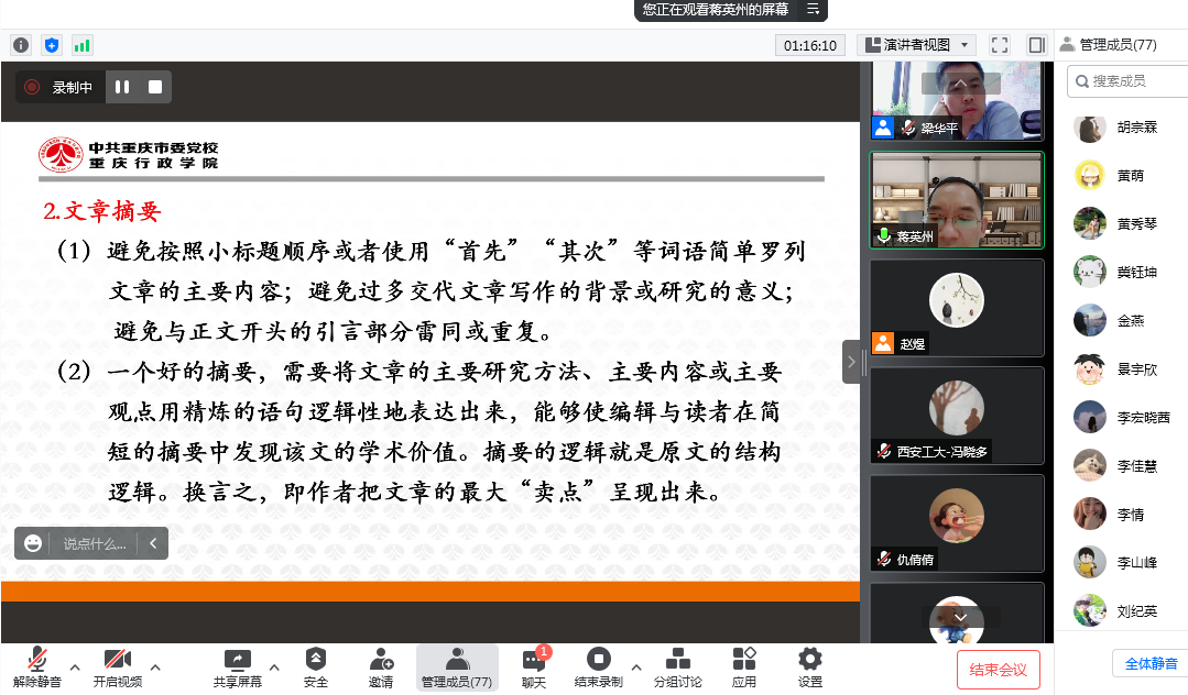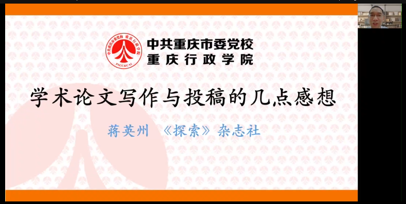 622日,17直播 邀请中共重庆市委党校《探索》杂志编辑部蒋英州教授在线上腾讯会议平台为17直播 全体师生做了题为“学术论文写作与投稿的几点感想”的学术讲座,此次为17直播 “精彩学术观”系列学术讲座第十六讲。讲座由17直播 副院长梁华平主持,17直播 全体师生参加了此次学术活动。