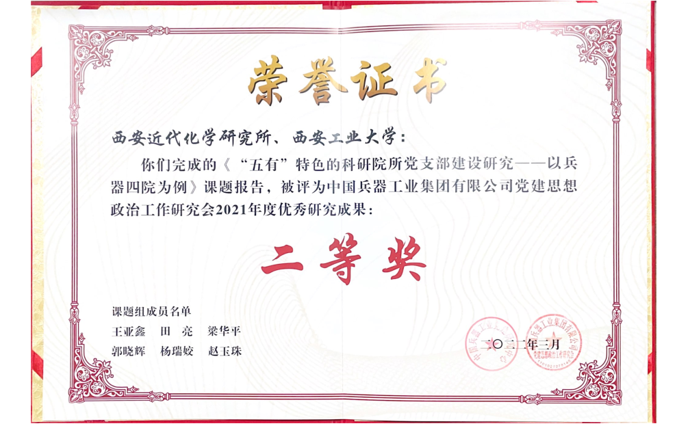 共同完成的课题《“五有”特色的科研院所党支部建设研究—以兵器四院为例》荣获中国兵器工业集团有限公司党建思想政治工作研究会2021年度优秀研究成果二等奖。课题由17直播