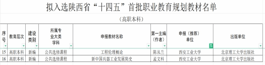 “中国式现代化暨强军伦理高水平学科团队”陈丛兰教授负责的《工程伦理概论》和孟文科副教授负责的《新中国兵器工业发展简史》。这次规划教材建设旨在深入贯彻落实习近平总书记关于职业教育工作和教材工作的重要指示批示精神和党的二十大精神,强化教材建设国家事权赋予省级的“规定”,突显职业教育类型特色,推进职业教育高质量发展,为陕西建设西部职业教育强省提供重要的支撑。
