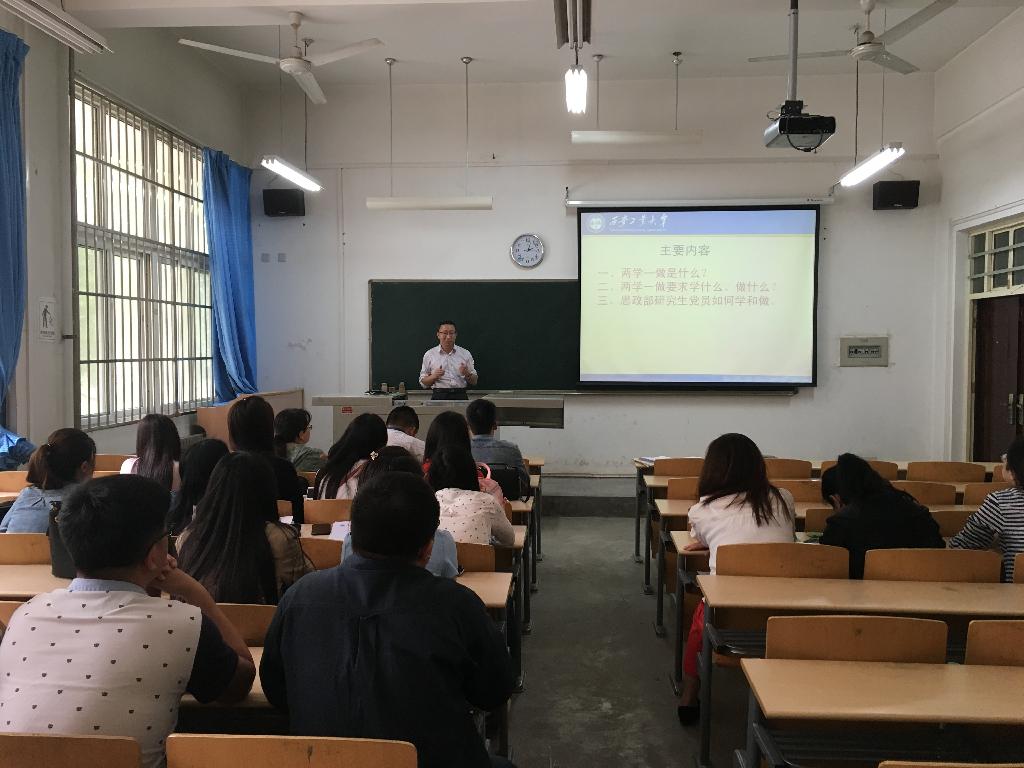 其次,何书记从“两学一做”学习活动对党员的具体要求出发,介绍了党员同志如何践行“两学一做”,并具体结合思政部研究生特点深入阐述了思政部研究生党员应该切合自身实际践行“两学一做”。
