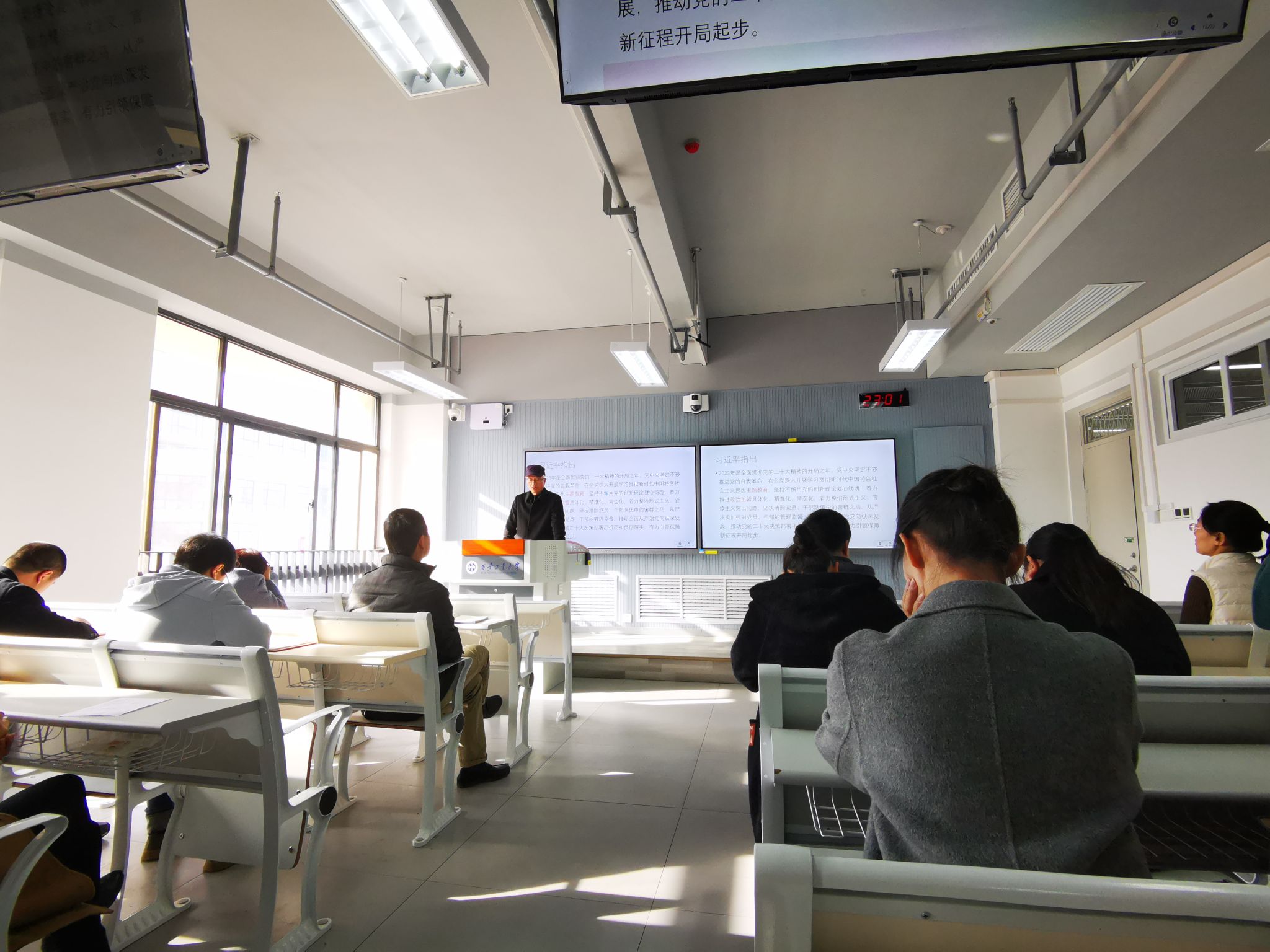在教七楼315教室召开教职工集体理论学习会,学习传达习近平总书记近期重要讲话精神和《习近平新时代中国特色社会主义思想学习纲要(2023版)》部分内容。会议由党委书记杨灏主持。