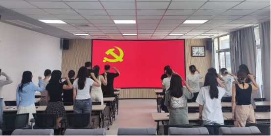 活动伊始,全体党员庄严肃立,面向鲜红的党旗,在支部书记杨婧的带领下,郑重地举起右拳,齐声宣誓。铿锵有力的誓言在会场内久久回荡,入党誓词里的每一个字都饱含着党员们对党的无限忠诚与坚定信仰,彰显了学生党员为党和人民的事业奋斗终身的决心。