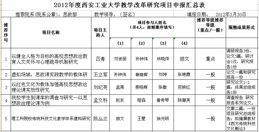 为进一步推进17直播 高等教育教学改革与质量工程顺利实施,加强高等教育质量内涵建设,深化教育教学改革,推进教育创新,培育高等教育教学成果,提高人才培养质量,提升17直播 高等教育的综合实力,经研究,学校决定开展2012年教学改革研究项目立项建设工作。思政部按照学校文件要求积极动员,共申报项目5项,其中重点项目一项、一般项目4项。