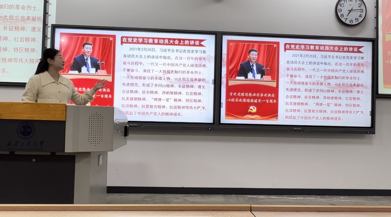 刘奕彤、张蓉、李萌萌等研究生分别以张思德精神、南泥湾精神和改革开放精神为主题,将广大青年学生的梦想融入中国梦,以党的先进思想为理论指导,立志成为国之栋梁。以《将“为人民服务”进行到底——纪念张思德精神》为题,围绕共产主义战士张思德,讲述了张思德精神的由来、内涵与时代价值,结合国情、世情与党情,积极呼吁作为新时代的中国青年,我们要勇敢肩负起时代赋予的重任,投身于铸牢中华民族共同体的伟大奋斗中去,积极践行张思德勇于牺牲、任劳任怨、艰苦奋斗的革命精神,努力在实现中华民族伟大复兴的中国梦的生动实践中放飞青春梦想!以《重温光辉岁月、传承南泥湾精神》为题,分享了延安精神的发源地之一——南泥湾的变化与发展,以及南泥湾精神的形成、内涵和当代价值,在面对世界百年未有之大变局和“两个一百年”奋斗目标历史交汇的关键节点,号召广大同学要继续传承和弘扬南泥湾精神,树立正确的奋斗观,拒绝“躺平”人生,不做“佛系”青年,用勤劳的双手、一流的业绩成就属于自己的精彩人生,让青春在新征程中绽放绚丽之花。以《袁家村集团化的发展之路》为题,讲述改革开放精神,介绍了陕西袁家村的改革之路,在郭裕禄、郭占武等带领下,通过几代人的不懈努力,逐渐脱贫致富,走向袁家村集团化发展,成为陕西农村改革的经典范例。在中国共产党的百年奋斗历程中,中国共产党精神也由生根发芽、茁壮成长,到枝繁叶茂、硕果累累,广大青年既是改革开放的见证者和受益者,也是“将改革开放进行到底”的参与者和贡献者,在改革开放中成长起来的广大青年,要在全面深化改革开放中,书写无愧于时代的壮丽篇章。