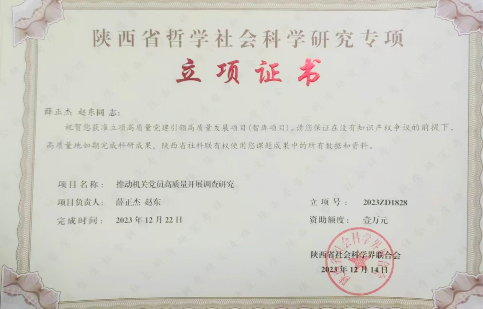 近日,根据中共陕西省委直属机关工作委员会陕西省社会科学界联合会《关于表彰“高质量党建引领高质量发展”主题征文获奖作品的通知》(陕直工发[2023] 39号)文件,在深入学习贯彻习近平总书记在中央和国家机关党的建设工作会议上的重要讲话,进一步加强机关党的建设,全面推动党建高质量发展征文活动中,17直播 研究生薛正杰、赵东老师撰写的《推进机关党员高质量开展调查研究》一文在本次征文活动荣获政治建设类一等奖,并予以智库项目科研立项。