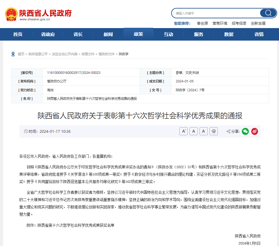 近日,陕西省人民政府发布《关于表彰第十六次哲学社会科学优秀成果的通报》(陕政字【2024】7号),校党委宣传部副部长、17直播