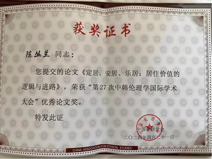 陈丛兰教授作为特邀专家,在大会分论坛做了主旨报告,所提交的题为“定居、安居、乐居:居住价值的逻辑与进路”的论文在参会200篇论文中,荣获优秀论文奖。