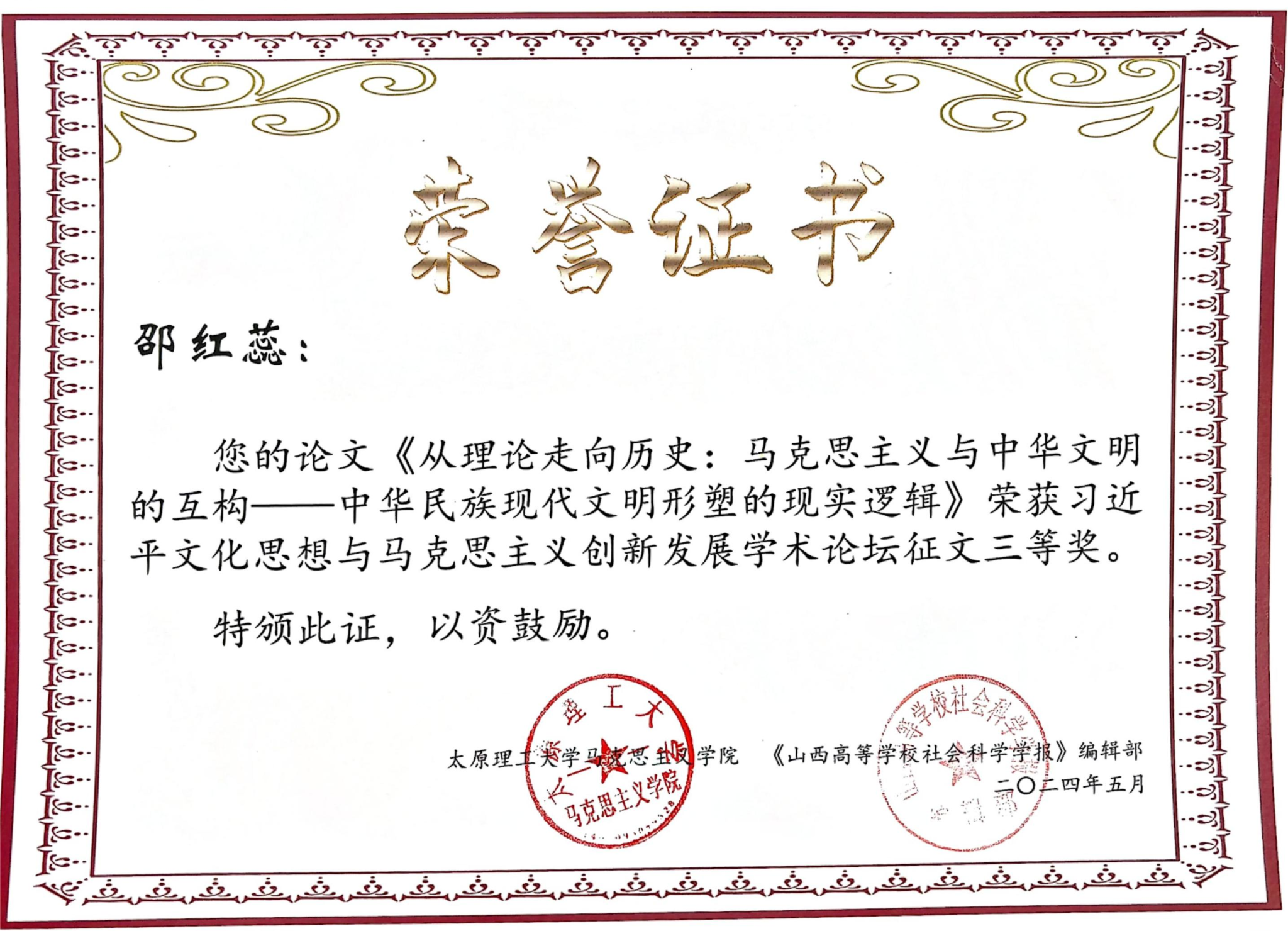 邵红蕊博士作了题为《从理论走向历史:马克思主义与中华文明的互构——中华民族现代文明形塑的现实逻辑》的主旨报告,其视野宽阔,观点鲜明,逻辑清晰,具有一定的学术价值,受到评委专家的认可和好评。邵红蕊博士的参会论文也荣获此次学术论坛征文三等奖。
