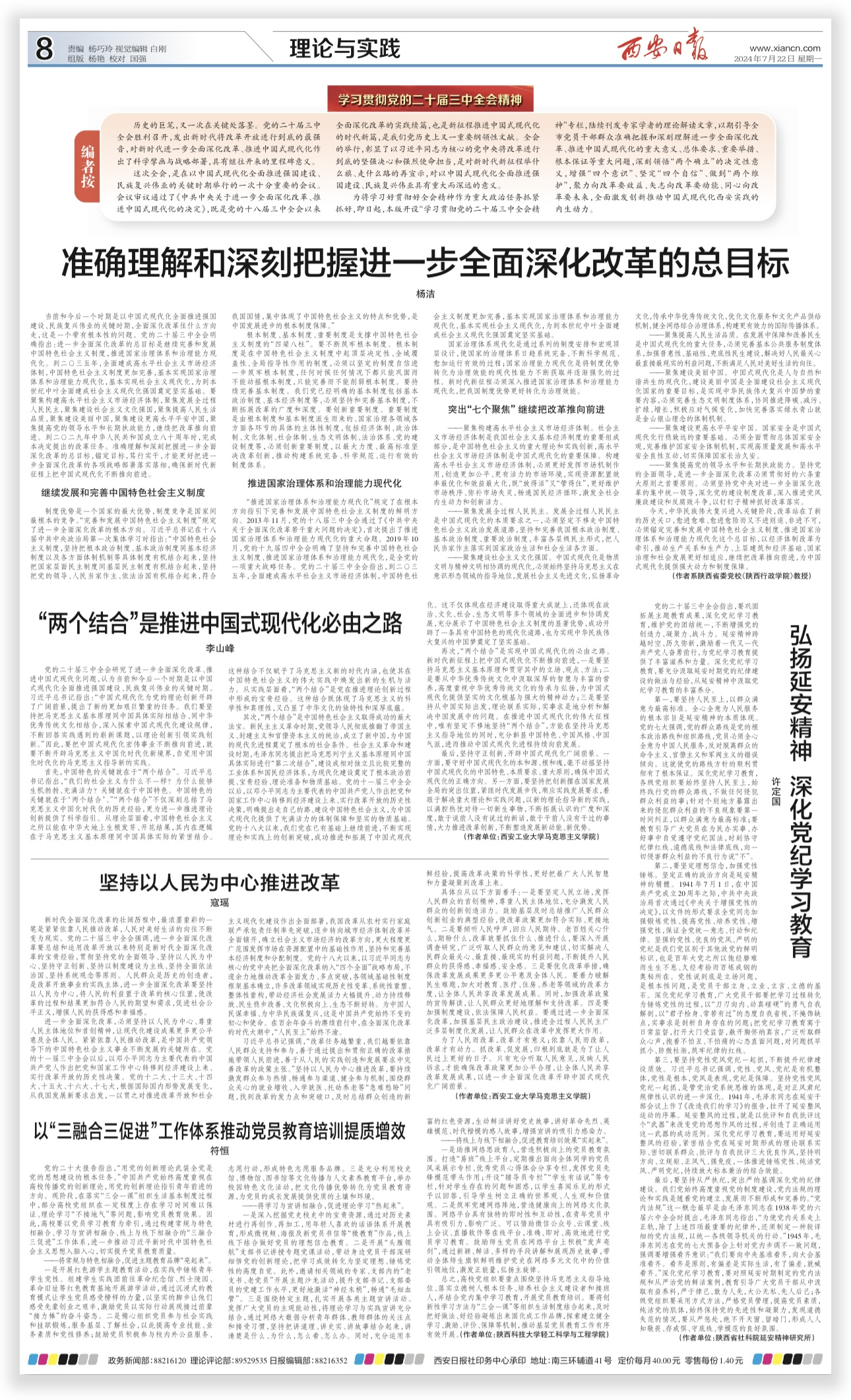寇瑶副教授文章《坚持以人民为中心推进改革》指出新时代全面深化改革的壮阔历程中,最浓墨重彩的一笔是紧紧依靠人民推动改革,进一步全面深化改革必须坚持以人民为中心。李山峰博士文章《“两个结合”是推进中国式现代化必由之路》指出党的二十届三中全会研究了进一步全面深化改革、推动中国式现代化的问题,指出中国特色的关键在于“两个结合”、“两个结合”是实现中国式现代化的必由之路。黄萌博士、窦欢博士等也分别从不同角度撰文阐释宣传三中全会党的最新理论成果。