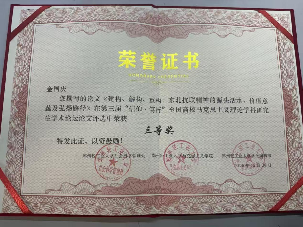 刘俊丽教授指导的硕士研究生金国庆所撰论文《建构、解构、重构:东北抗联精神的源头活水、价值意蕴及弘扬路径》荣获学会2025年学术年会征文三等奖。