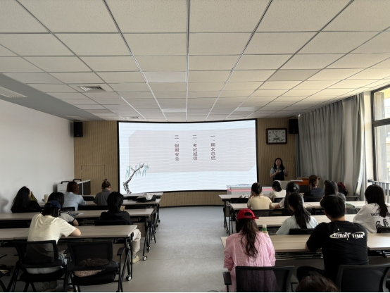 于教7-503召开期末主题班会,研一班主任裴欣围绕期末学习总结、考试诚信和假期安全三方面关键事项展开。